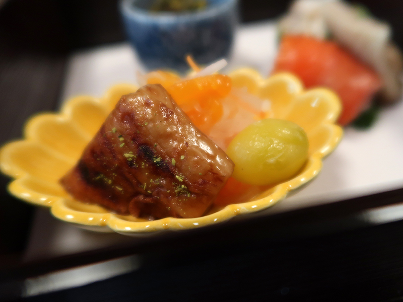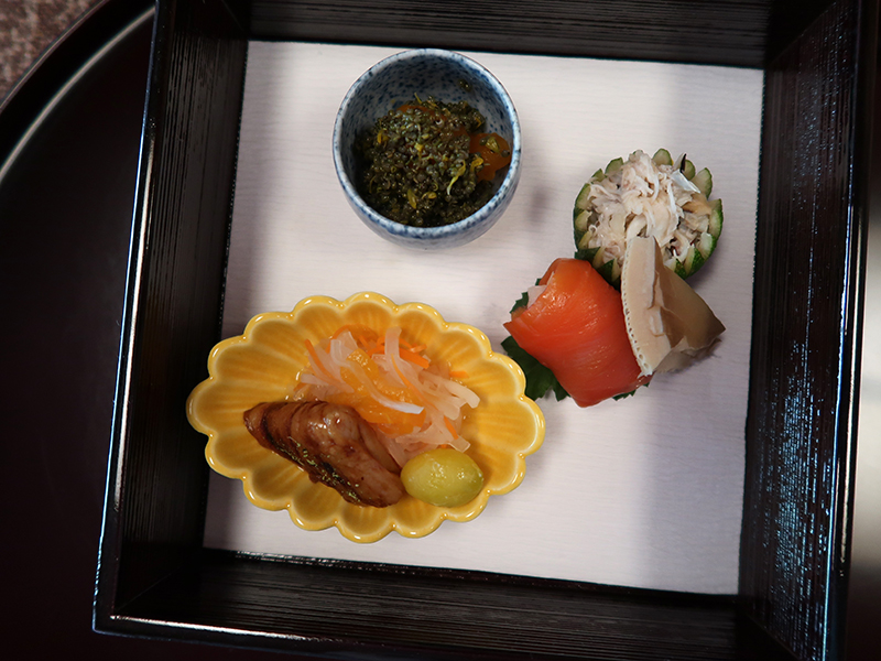 黄色の小皿には、柿なますに銀杏、庄内麸。
