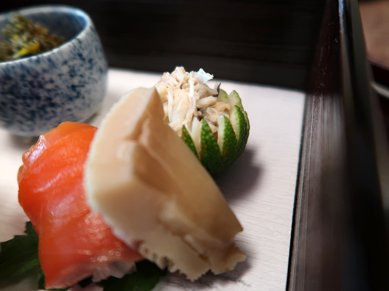 飾り切りした酢橘の器には菱蟹の酒盗和え。