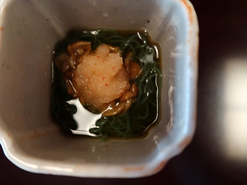なめ茸、紅葉おろしを載せた蒟蒻蕎麦。