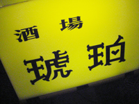 “BAR”と書かずに”酒場”と謳う「琥珀」へといざ。暗がりのカウンターは、柱を介してL字に廻っていて、ちょうど空いていた正面へと並んで座ります。