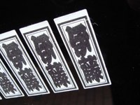 そこへ近づいてよく見ると、ドア硝子の隅に千社札が5枚ほど並べて貼られてる。