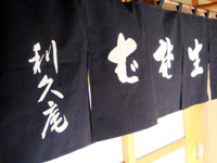 濃紺の暖簾の右手にある行灯には、草書の文字。