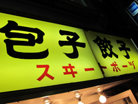 「包子餃子」の4文字が、やや暗がりの夜の通りに浮かんでいます。
