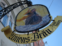 このエンブレムがビール蔵「ウニオンス・ブロイ」の目印です。