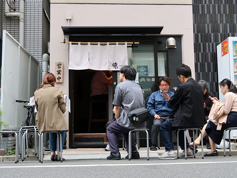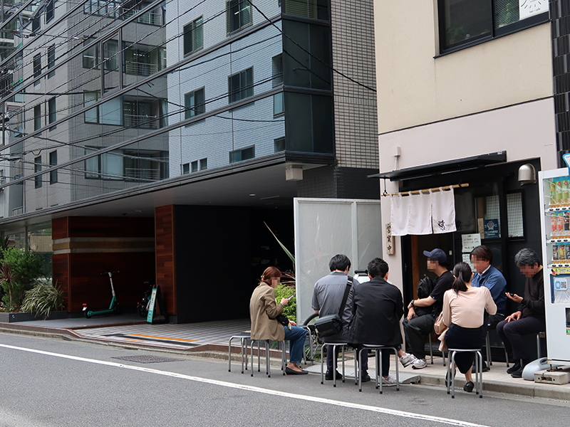 およそ必ず、空席待ちの一群に出会す。 立ちん坊ではなく、丸椅子があるのが、