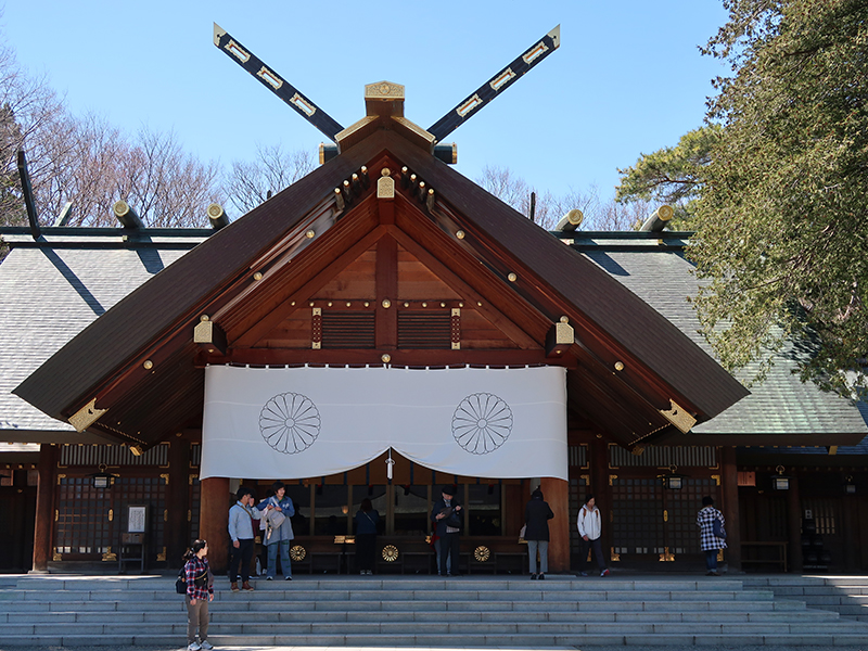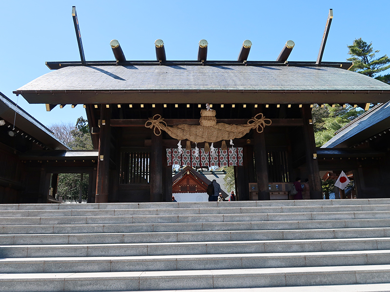 北海道神宮の神門までやってきた。 中央が太い注連縄の形と両端の4つの輪が面白い。