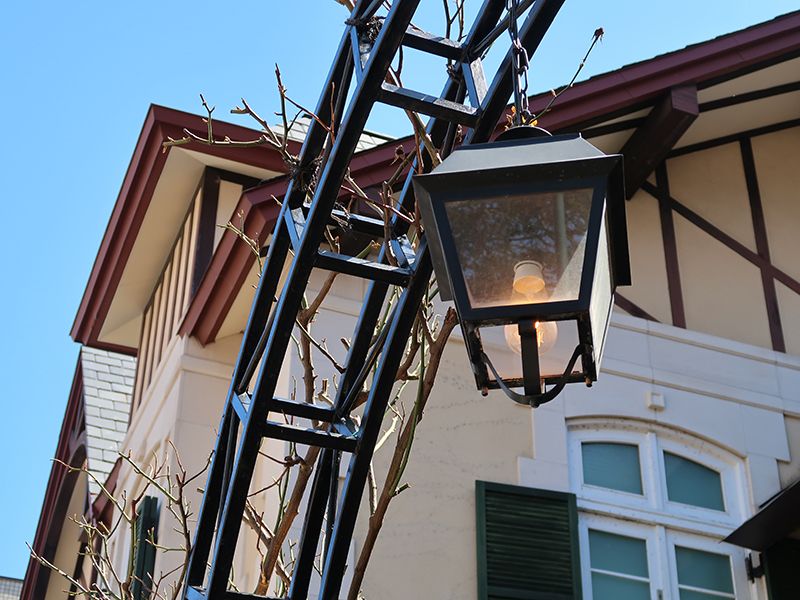 門柱の両サイドには、金色の銘板が迎える。 門柱を渡したアーチには、