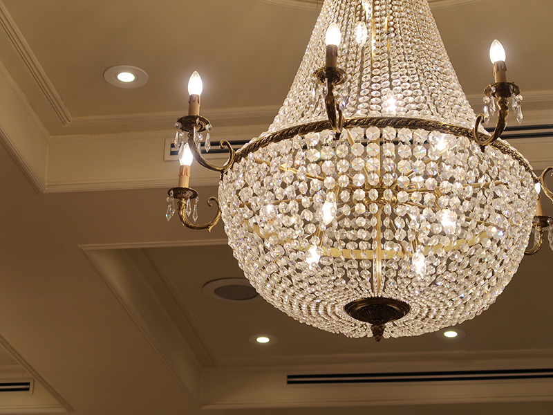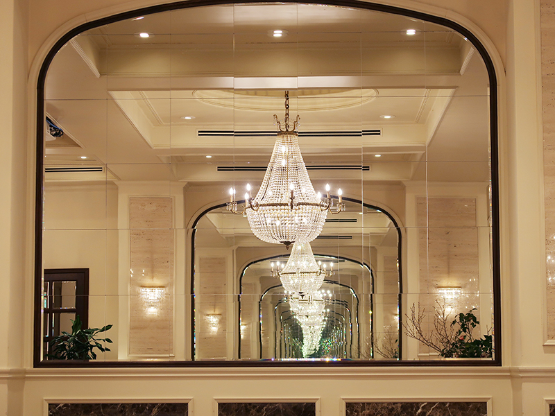 豪華なシャンデリアが華やかな演出をしている。 両側の壁に向い合せた鏡、合わせ鏡によって、