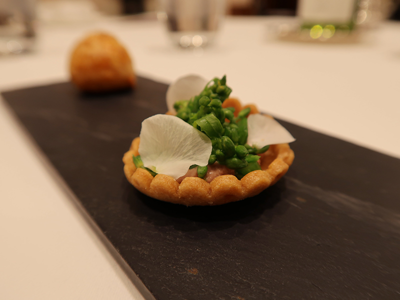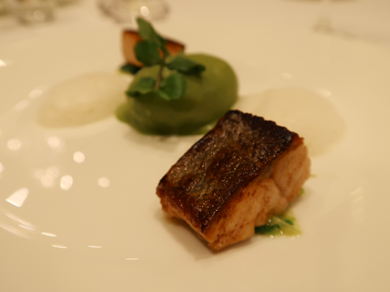 レタスとヒトビロのエテュベ」。 旬を迎えた桜鱒の下には、ヒトビロ。