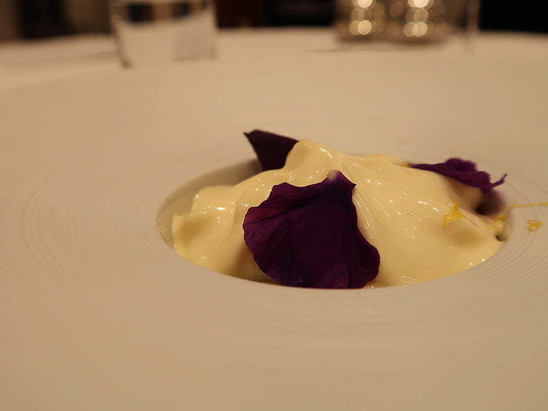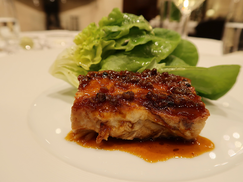 「桜の花でマリネしたルスツ豚バラ肉のブレゼ」。 メインのお肉は、北海道ルスツの三元豚。
