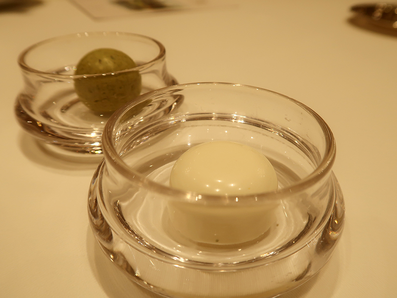 口開きの小さなおつまみが長いプレートに3品。 シュー生地にチーズを練り込んで、