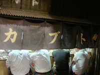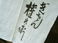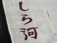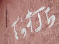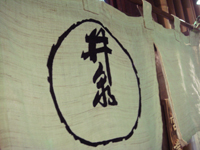 酒房「大甚中店」で 大きく酒と示す白い暖簾ゆるゆると
