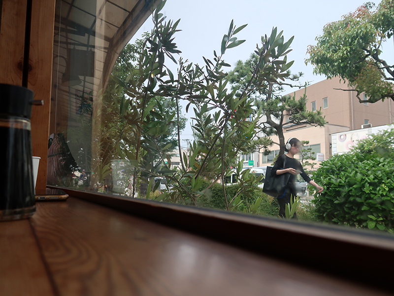 道路側の硝子窓沿いにカウンター席がある。 カウンター席の右隅に陣取れば、