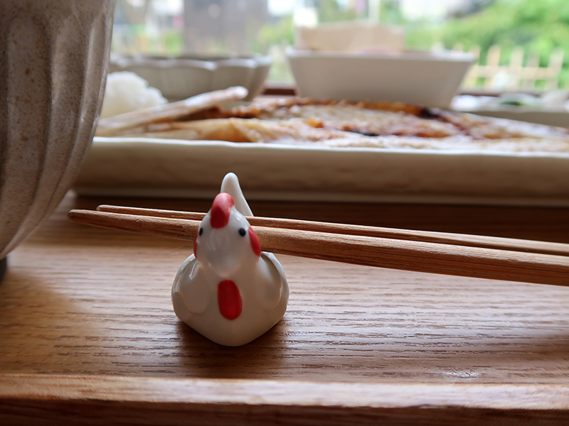箸を手にしようとして箸置きをじっと見る。 ナハハ、ここにも鶏が、いた(^^)。