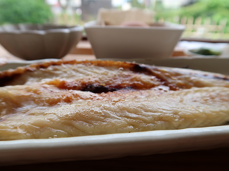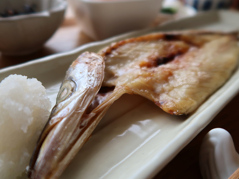 お盆の中央に構えるは勿論、カマスの干物。 焼かれて滲み出した脂が、如何にももう旨そう。