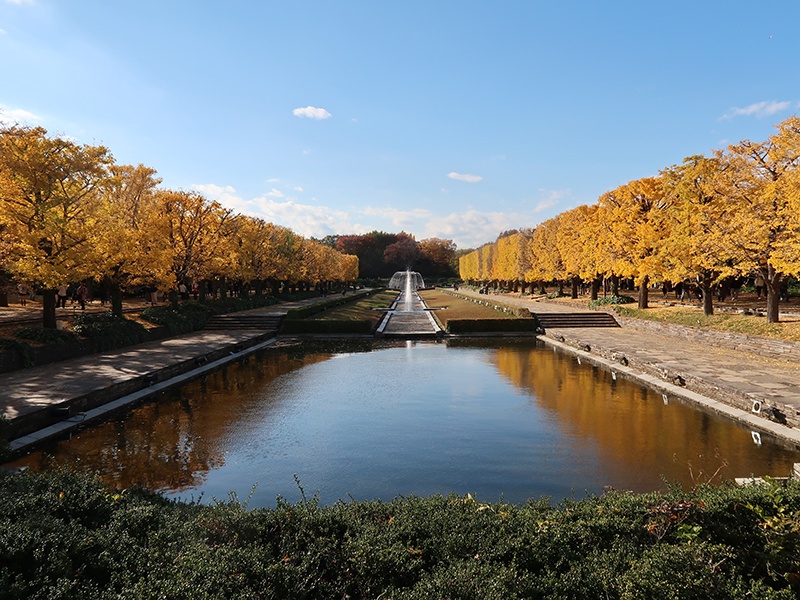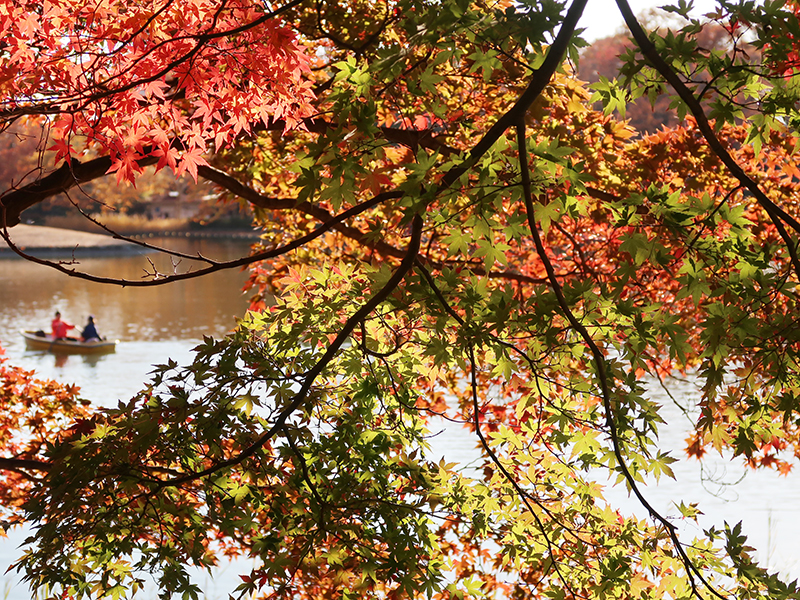 ボートが何艘も浮かぶ水鳥の池がある。 赤黄橙緑と紅葉がグラデーションを魅せていた、