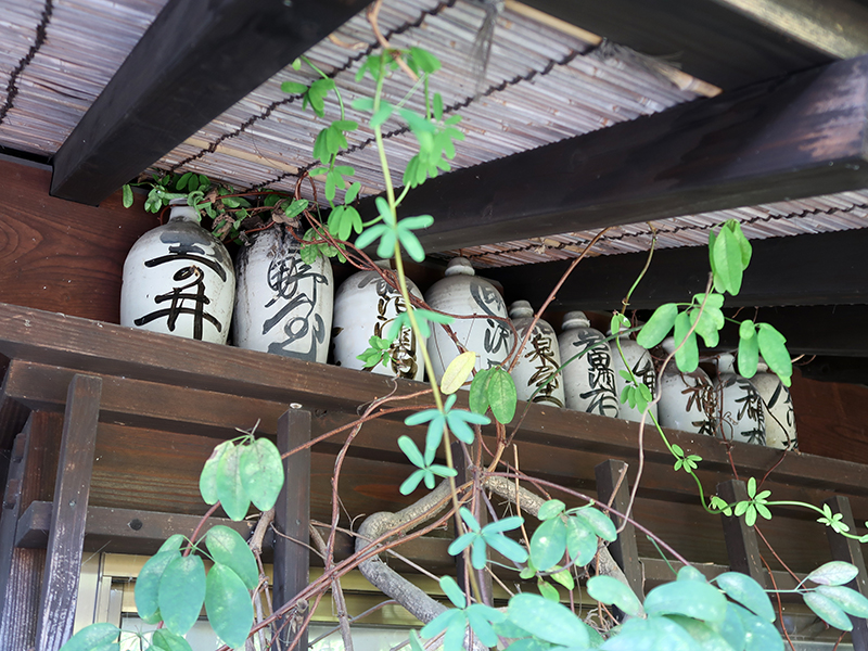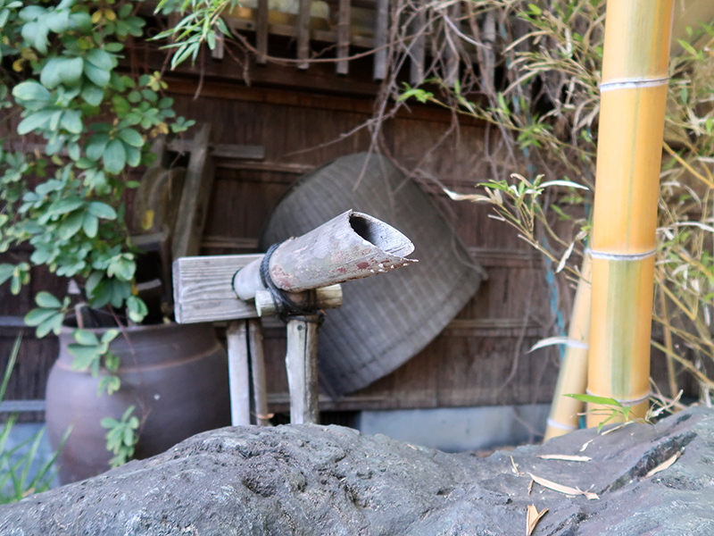筆文字をあしらった大徳利が並んでいる。 足許を見れば、涸れた蹲踞が、