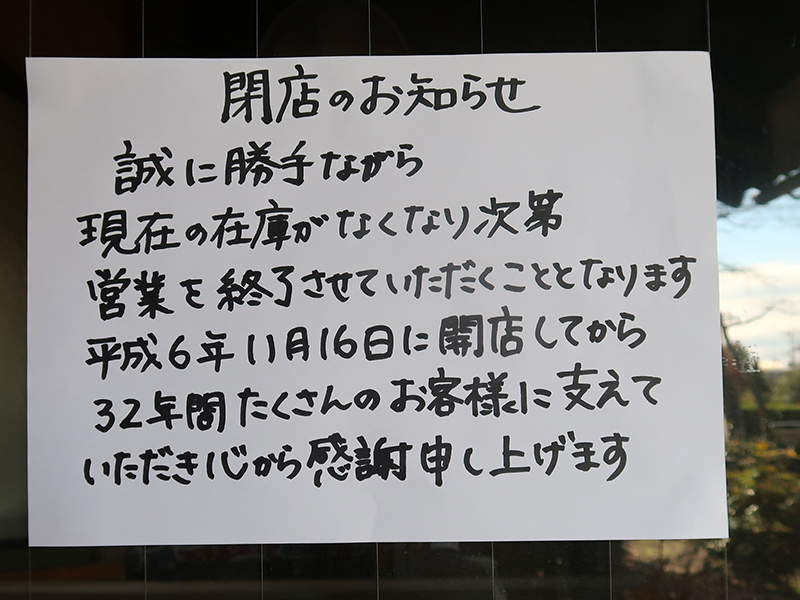 麺打ち場の硝子に貼られた貼紙に驚いた。 現在の在庫がなくなり次第営業を終了し、