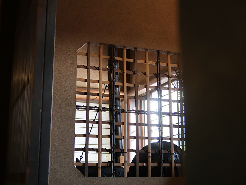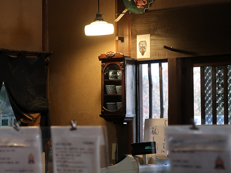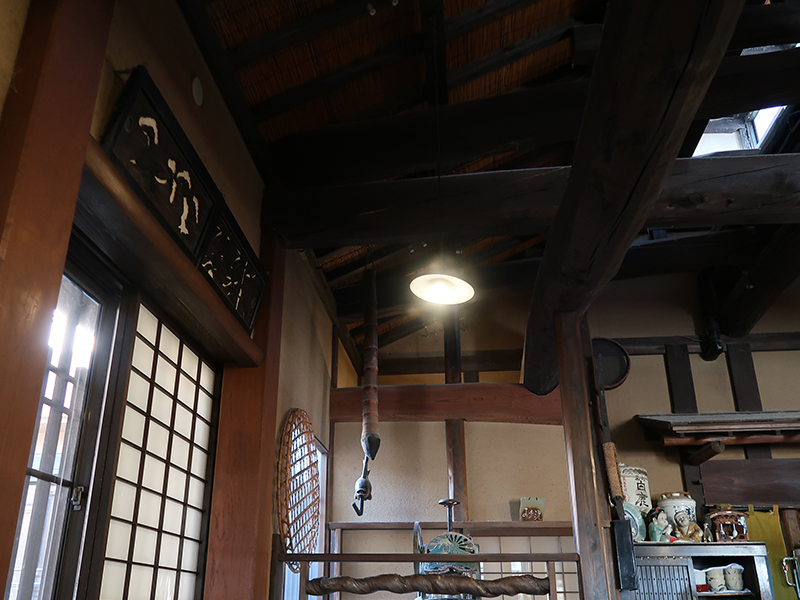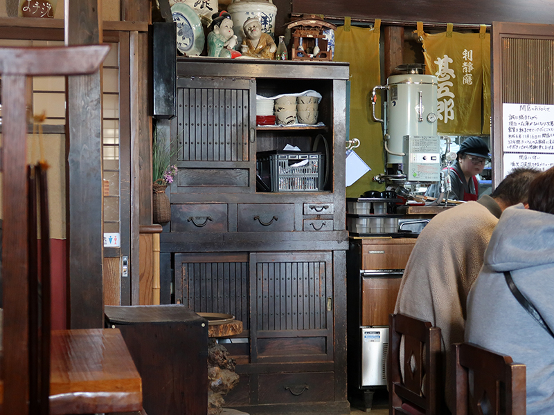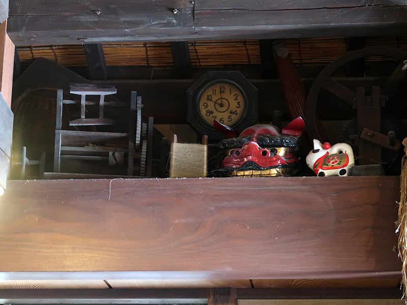 梁上棚には、獅子頭や古時計が見える。 厨房側の壁には、アンティークな水屋箪笥。
