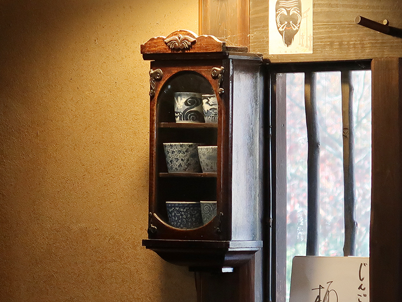 古時計を改造したかのような飾り棚。 硝子越しに六つの蕎麦猪口が窺えます。