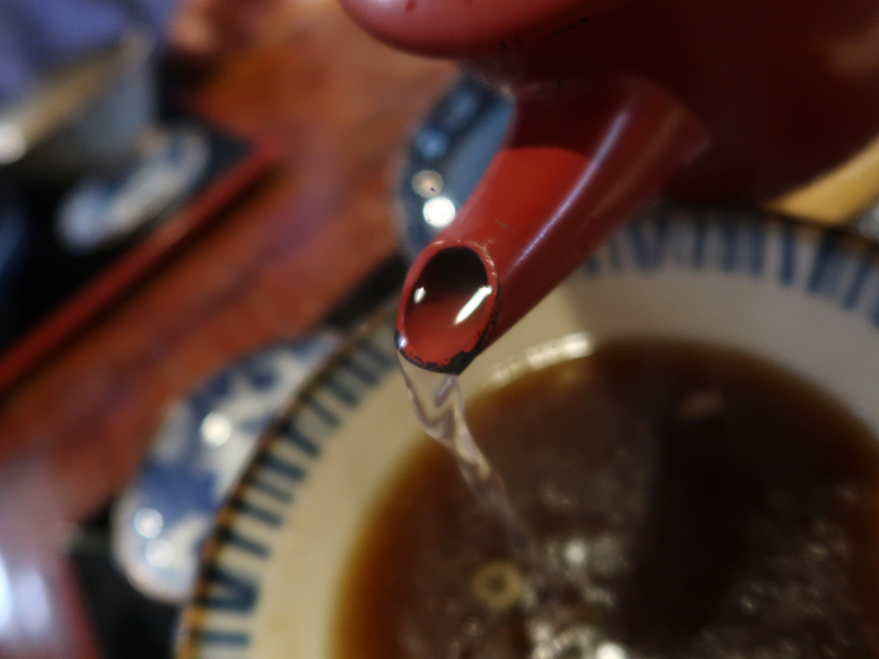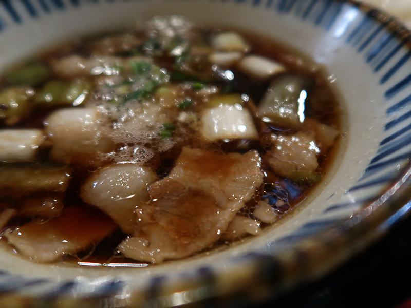 バラ肉に焼き葱、揚げた茄子が浮かぶ。 鰹、昆布に加えて、