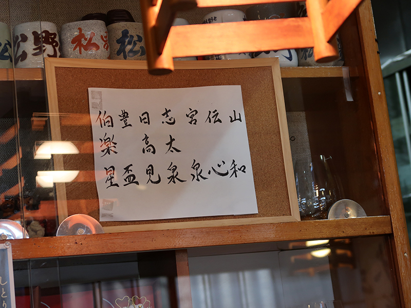 カウンターの脇の硝子棚の中にコルクボードがあり、